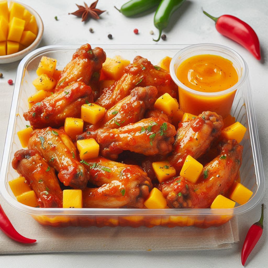 Alitas con Salsa Muy Picante de Mango Habanero Snacks – Aprox 300 g de deliciosas alitas de pollo fritas, sazonadas y servidas con una exquisita salsa muy Picante de Mango Habanero