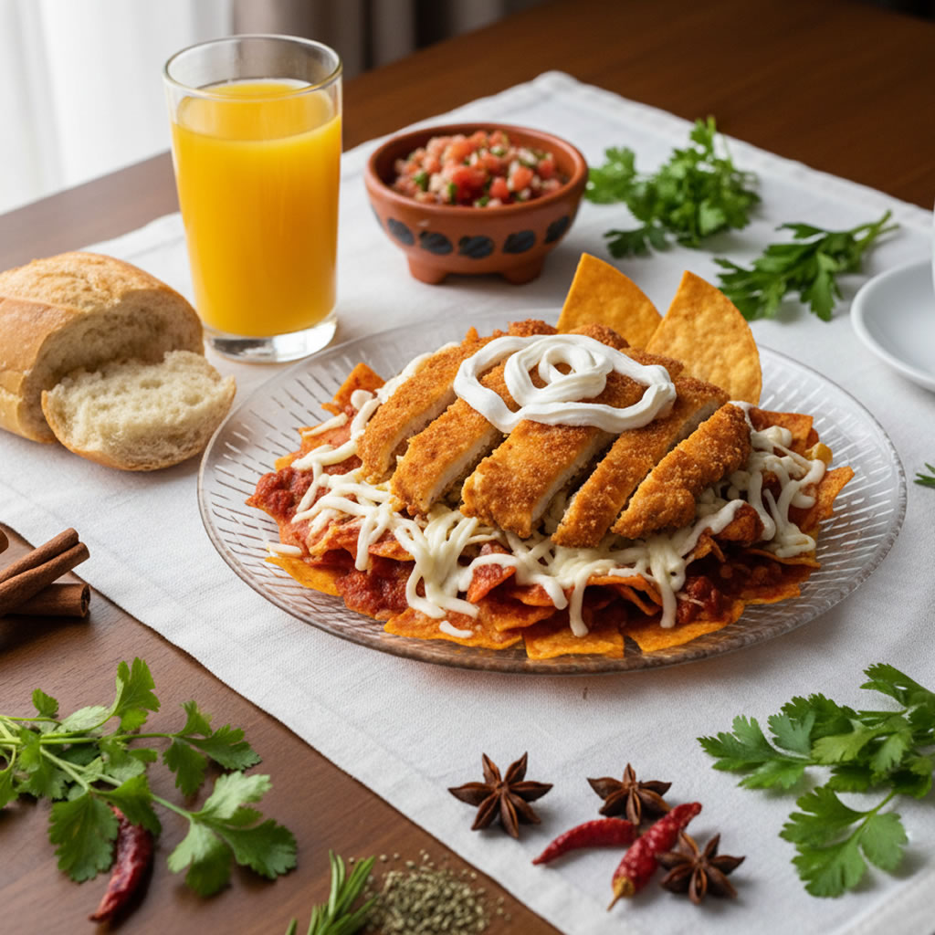 Chilaquiles Rojos con Milanesa de Pollo