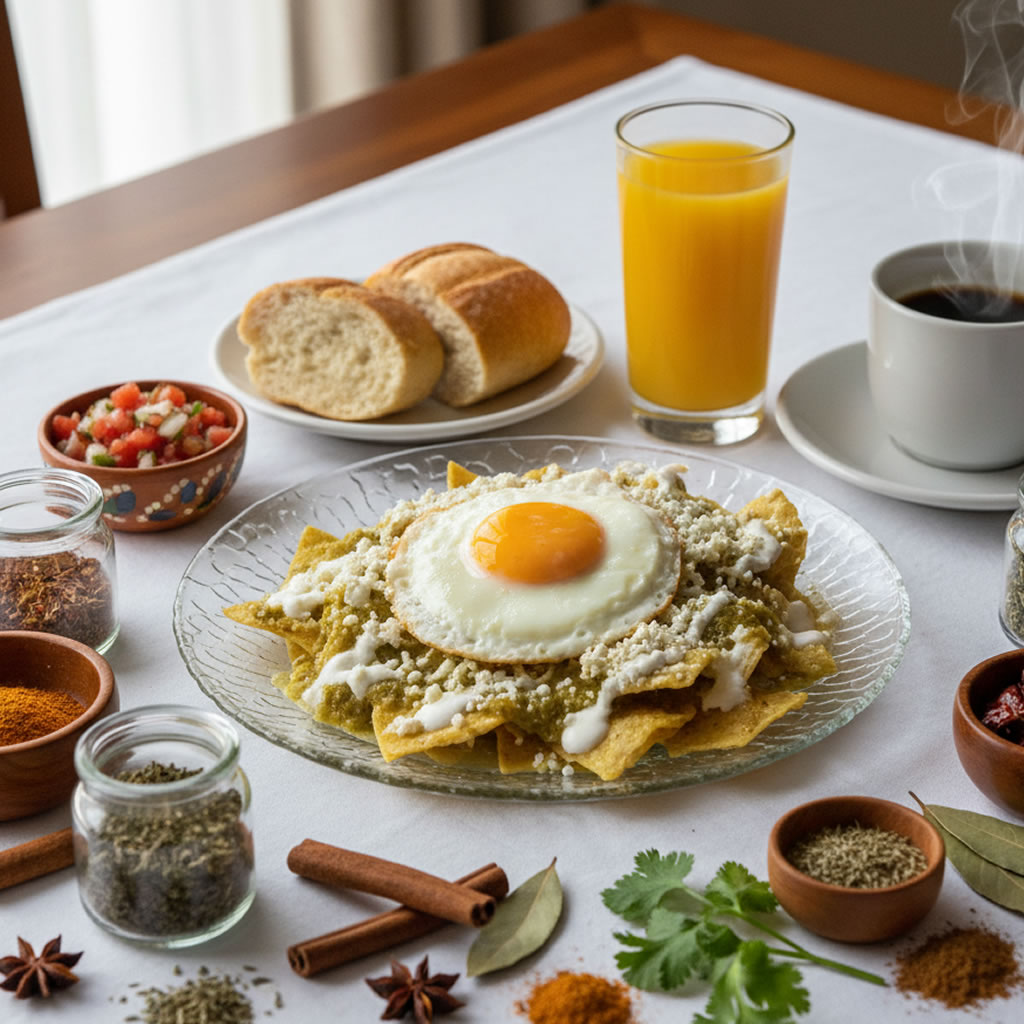 Deliciosos Chilaquiles en salsa verde picosita con crema, queso rayado y Huevo, acompañados de unos frijolitos refritos con crema, queso rayado y totopos incluye una pieza de pan blanco.
