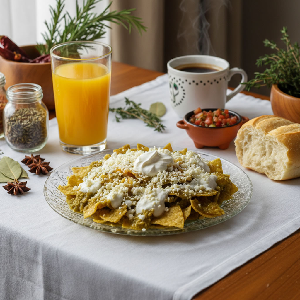 Chilaquiles Verdes Sencillos. – Deliciosos Chilaquiles en salsa verde picosita con crema, queso rayado, acompañados de unos frijolitos refritos con crema, queso rayado y totopos incluye una pieza de pan blanco.